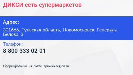 ДИКСИ, сеть супермаркетов по адресу 301666, Тульская область, Новомосковск, Генерала Белова, 3 в дальнейшем Организация, размещена в следующих категориях: