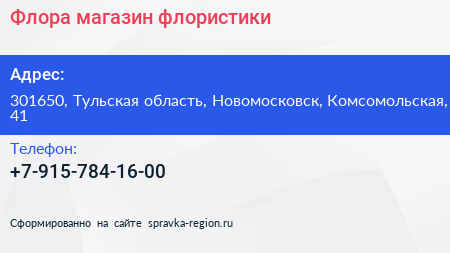 Флора, магазин флористики по адресу 301650, Тульская область, Новомосковск, Комсомольская, 41 в дальнейшем Организация, размещена в следующих категориях: