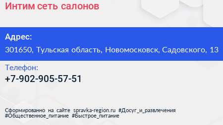 Интим, сеть салонов по адресу 301650, Тульская область, Новомосковск, Садовского, 13 в дальнейшем Организация, размещена в следующих категориях: