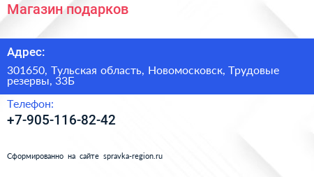 Магазин подарков по адресу 301650, Тульская область, Новомосковск, Трудовые резервы, 33Б в дальнейшем Организация, размещена в следующих категориях:
