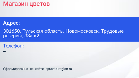 Магазин цветов по адресу 301650, Тульская область, Новомосковск, Трудовые резервы, 33а к2 в дальнейшем Организация, размещена в следующих категориях:
