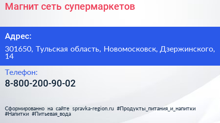 Магнит, сеть супермаркетов по адресу 301650, Тульская область, Новомосковск, Дзержинского, 14 в дальнейшем Организация, размещена в следующих категориях: