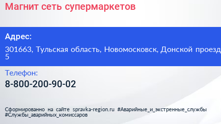 Магнит, сеть супермаркетов по адресу 301663, Тульская область, Новомосковск, Донской проезд, 5 в дальнейшем Организация, размещена в следующих категориях: