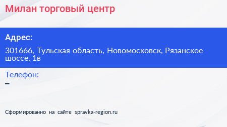 Милан, торговый центр по адресу 301666, Тульская область, Новомосковск, Рязанское шоссе, 1в в дальнейшем Организация, размещена в следующих категориях: