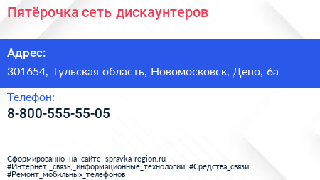 Пятёрочка, сеть дискаунтеров по адресу 301654, Тульская область, Новомосковск, Депо, 6а в дальнейшем Организация, размещена в следующих категориях: