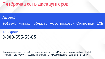 Пятёрочка, сеть дискаунтеров по адресу 301664, Тульская область, Новомосковск, Солнечная, 10Б в дальнейшем Организация, размещена в следующих категориях: