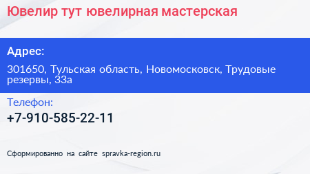 Ювелир тут, ювелирная мастерская по адресу 301650, Тульская область, Новомосковск, Трудовые резервы, 33а в дальнейшем Организация, размещена в следующих категориях: