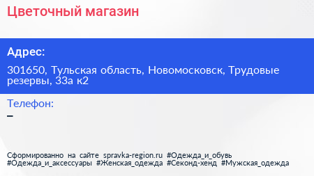 Цветочный магазин по адресу 301650, Тульская область, Новомосковск, Трудовые резервы, 33а к2 в дальнейшем Организация, размещена в следующих категориях: