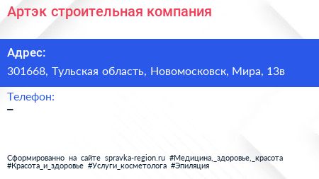 Артэк, строительная компания по адресу 301668, Тульская область, Новомосковск, Мира, 13в в дальнейшем Организация, размещена в следующих категориях:
