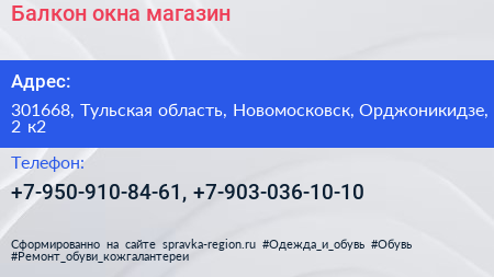 Балкон-окна, магазин по адресу 301668, Тульская область, Новомосковск, Орджоникидзе, 2 к2 в дальнейшем Организация, размещена в следующих категориях: