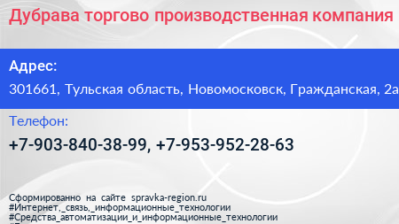 Дубрава, торгово-производственная компания по адресу 301661, Тульская область, Новомосковск, Гражданская, 2а в дальнейшем Организация, размещена в следующих категориях: