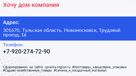 Хочу дом, компания по адресу 301670, Тульская область, Новомосковск, Трудовой проезд, 1в в дальнейшем Организация, размещена в следующих категориях: