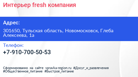 Интерьер-fresh, компания по адресу 301650, Тульская область, Новомосковск, Глеба Алексеева, 1а в дальнейшем Организация, размещена в следующих категориях: