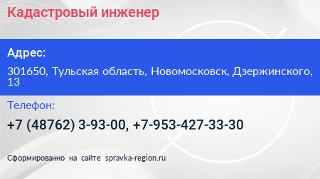 Кадастровый инженер по адресу 301650, Тульская область, Новомосковск, Дзержинского, 13 в дальнейшем Организация, размещена в следующих категориях: