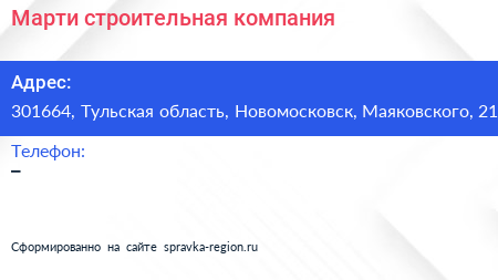 Марти, строительная компания по адресу 301664, Тульская область, Новомосковск, Маяковского, 21 в дальнейшем Организация, размещена в следующих категориях: