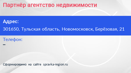 Партнёр, агентство недвижимости по адресу 301650, Тульская область, Новомосковск, Берёзовая, 21 в дальнейшем Организация, размещена в следующих категориях: