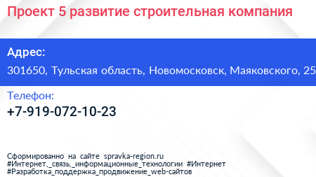 Проект 5 развитие, строительная компания по адресу 301650, Тульская область, Новомосковск, Маяковского, 25 в дальнейшем Организация, размещена в следующих категориях: