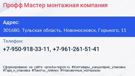 Профф-Мастер, монтажная компания по адресу 301680, Тульская область, Новомосковск, Горького, 11 в дальнейшем Организация, размещена в следующих категориях: