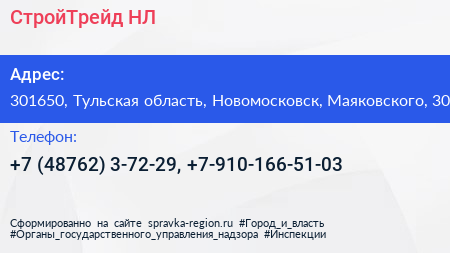 СтройТрейд-НЛ по адресу 301650, Тульская область, Новомосковск, Маяковского, 30 в дальнейшем Организация, размещена в следующих категориях: