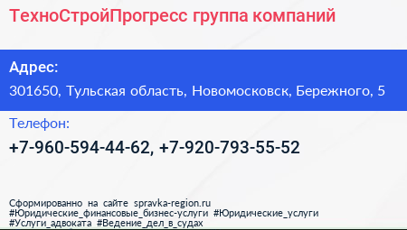 ТехноСтройПрогресс, группа компаний по адресу 301650, Тульская область, Новомосковск, Бережного, 5 в дальнейшем Организация, размещена в следующих категориях: