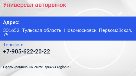 Универсал, авторынок по адресу 301652, Тульская область, Новомосковск, Первомайская, 75 в дальнейшем Организация, размещена в следующих категориях: