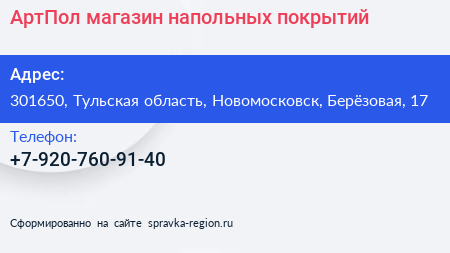 АртПол, магазин напольных покрытий по адресу 301650, Тульская область, Новомосковск, Берёзовая, 17 в дальнейшем Организация, размещена в следующих категориях: