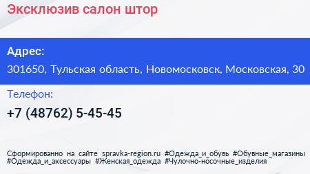 Эксклюзив, салон штор по адресу 301650, Тульская область, Новомосковск, Московская, 30 в дальнейшем Организация, размещена в следующих категориях: