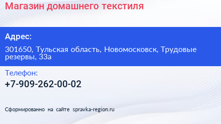 Магазин домашнего текстиля по адресу 301650, Тульская область, Новомосковск, Трудовые резервы, 33а в дальнейшем Организация, размещена в следующих категориях: