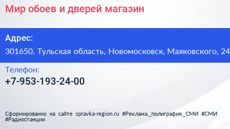 Мир обоев и дверей, магазин по адресу 301650, Тульская область, Новомосковск, Маяковского, 24 в дальнейшем Организация, размещена в следующих категориях:
