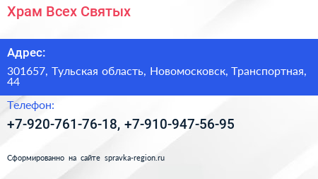 Храм Всех Святых по адресу 301657, Тульская область, Новомосковск, Транспортная, 44 в дальнейшем Организация, размещена в следующих категориях: