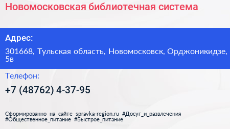 Новомосковская библиотечная система по адресу 301668, Тульская область, Новомосковск, Орджоникидзе, 5в в дальнейшем Организация, размещена в следующих категориях: