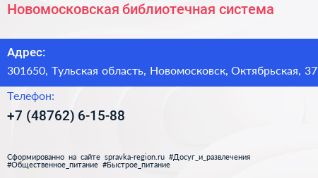 Новомосковская библиотечная система по адресу 301650, Тульская область, Новомосковск, Октябрьская, 37 в дальнейшем Организация, размещена в следующих категориях: