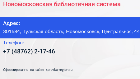 Новомосковская библиотечная система по адресу 301684, Тульская область, Новомосковск, Центральная, 44 в дальнейшем Организация, размещена в следующих категориях:
