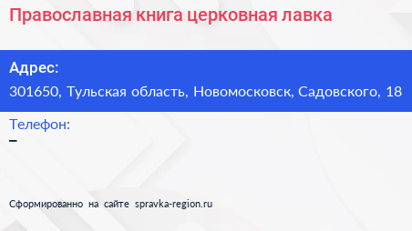 Православная книга, церковная лавка по адресу 301650, Тульская область, Новомосковск, Садовского, 18 в дальнейшем Организация, размещена в следующих категориях: