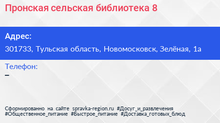 Пронская сельская библиотека №8 по адресу 301733, Тульская область, Новомосковск, Зелёная, 1а в дальнейшем Организация, размещена в следующих категориях: