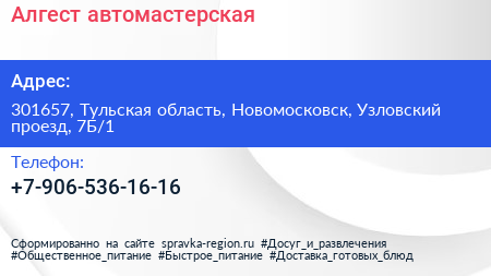 Алгест, автомастерская по адресу 301657, Тульская область, Новомосковск, Узловский проезд, 7Б/1 в дальнейшем Организация, размещена в следующих категориях:
