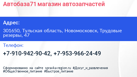 Автобаза71, магазин автозапчастей по адресу 301650, Тульская область, Новомосковск, Трудовые резервы, 47 в дальнейшем Организация, размещена в следующих категориях: