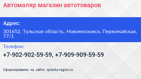 Автомаляр, магазин автотоваров по адресу 301652, Тульская область, Новомосковск, Первомайская, 77/1 в дальнейшем Организация, размещена в следующих категориях:
