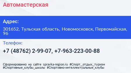 Автомастерская по адресу 301652, Тульская область, Новомосковск, Первомайская, 96 в дальнейшем Организация, размещена в следующих категориях: