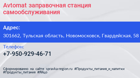 Avtomat, заправочная станция самообслуживания по адресу 301662, Тульская область, Новомосковск, Гвардейская, 58 в дальнейшем Организация, размещена в следующих категориях: