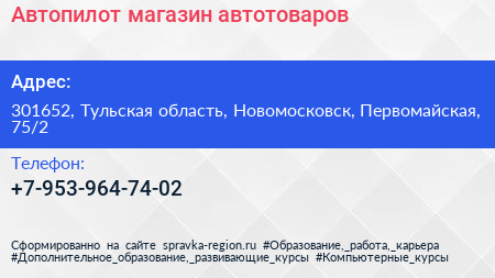 Автопилот, магазин автотоваров по адресу 301652, Тульская область, Новомосковск, Первомайская, 75/2 в дальнейшем Организация, размещена в следующих категориях: