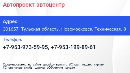 Автопроект, автоцентр по адресу 301657, Тульская область, Новомосковск, Техническая, 8 в дальнейшем Организация, размещена в следующих категориях: