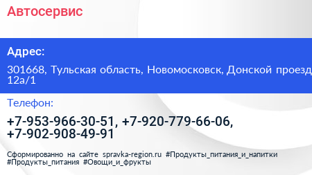 Автосервис по адресу 301668, Тульская область, Новомосковск, Донской проезд, 12а/1 в дальнейшем Организация, размещена в следующих категориях: