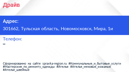 Драйв по адресу 301662, Тульская область, Новомосковск, Мира, 1и в дальнейшем Организация, размещена в следующих категориях: