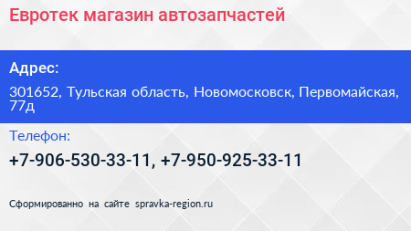 Евротек, магазин автозапчастей по адресу 301652, Тульская область, Новомосковск, Первомайская, 77д в дальнейшем Организация, размещена в следующих категориях: