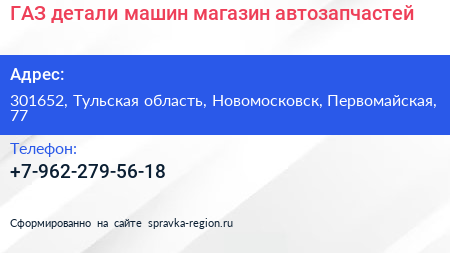 ГАЗ детали машин, магазин автозапчастей по адресу 301652, Тульская область, Новомосковск, Первомайская, 77 в дальнейшем Организация, размещена в следующих категориях: