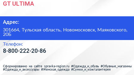 GT ULTIMA по адресу 301664, Тульская область, Новомосковск, Маяковского, 20Б в дальнейшем Организация, размещена в следующих категориях: