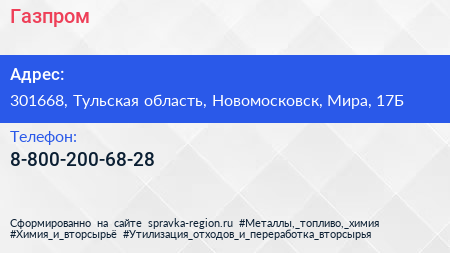 Газпром по адресу 301668, Тульская область, Новомосковск, Мира, 17Б в дальнейшем Организация, размещена в следующих категориях: