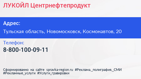 ЛУКОЙЛ-Центрнефтепродукт по адресу Тульская область, Новомосковск, Космонавтов, 20 в дальнейшем Организация, размещена в следующих категориях: