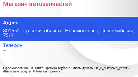 Магазин автозапчастей по адресу 301652, Тульская область, Новомосковск, Первомайская, 75/4 в дальнейшем Организация, размещена в следующих категориях: